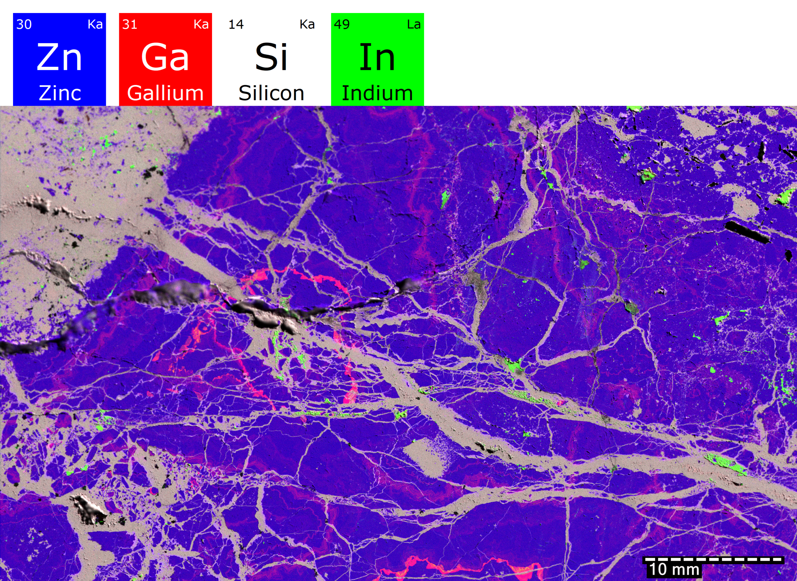 Figure 9. MicroXRF elemental map of a chromium-bearing sample from the Stillwater Complex, Montana. This microXRF map shows the spatial distribution of Cr relative to major elements (e.g., Fe, Ca) within a large slab from the Stillwater Complex—the largest domestic source of chromium in the United States. Mineral-scale Cr heterogeneity highlights chromite-rich domains and their textural relationships within the host lithology, providing insight into critical mineral occurrence and distribution. The map demonstrates the value of microXRF for non-destructive characterization of Cr-bearing materials relevant to resource evaluation and renewed exploration interest.