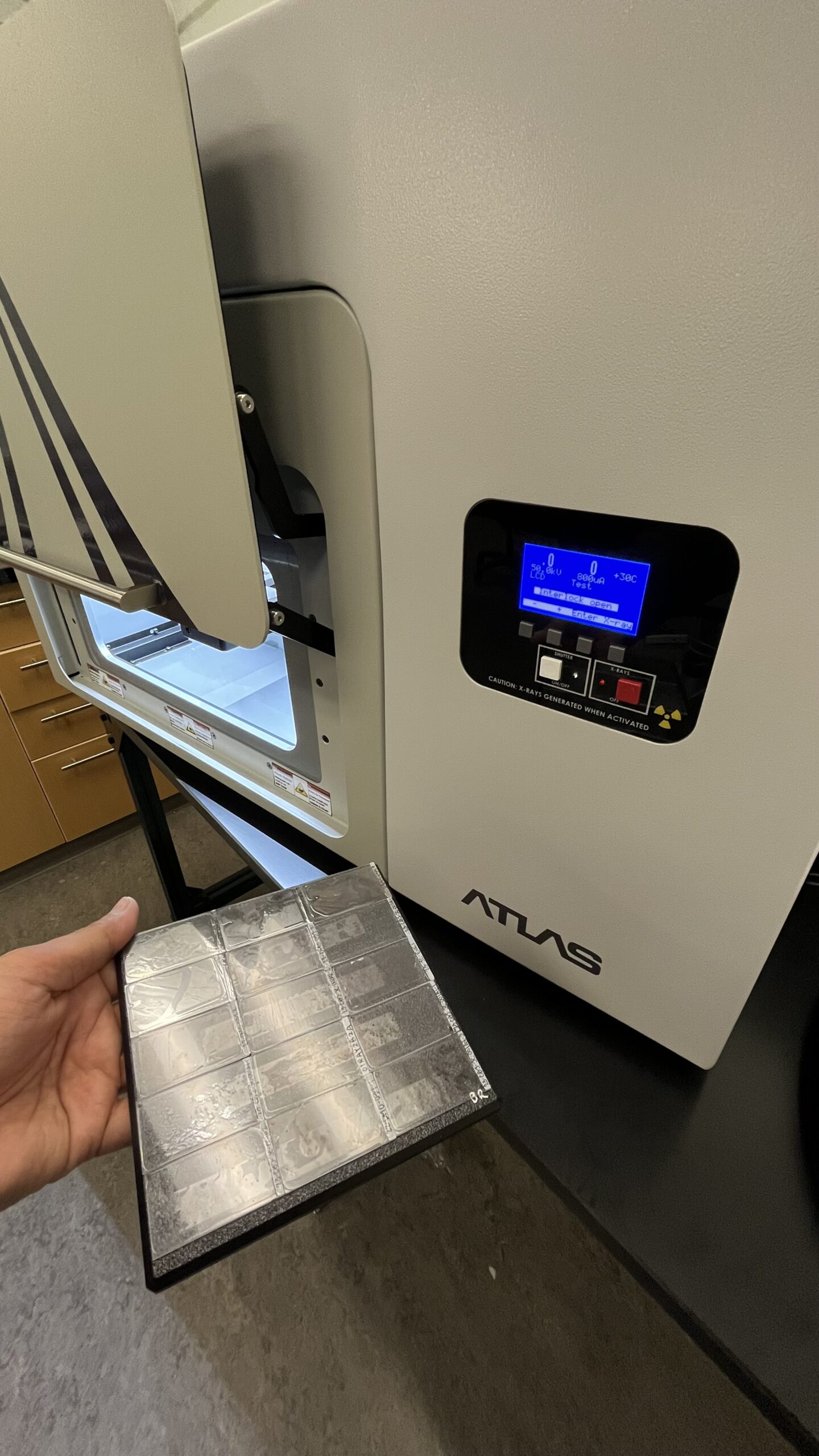 Figure 2: On the left, the Atlas M microXRF system is shown in standby mode, ready to receive thin section samples for analysis. The right image provides a view inside the Atlas M chamber, displaying 15 prepared thin sections securely positioned in the sample holder just before the start of the analysis run. This showcases the system’s capacity for high-throughput, simultaneous sample processing.