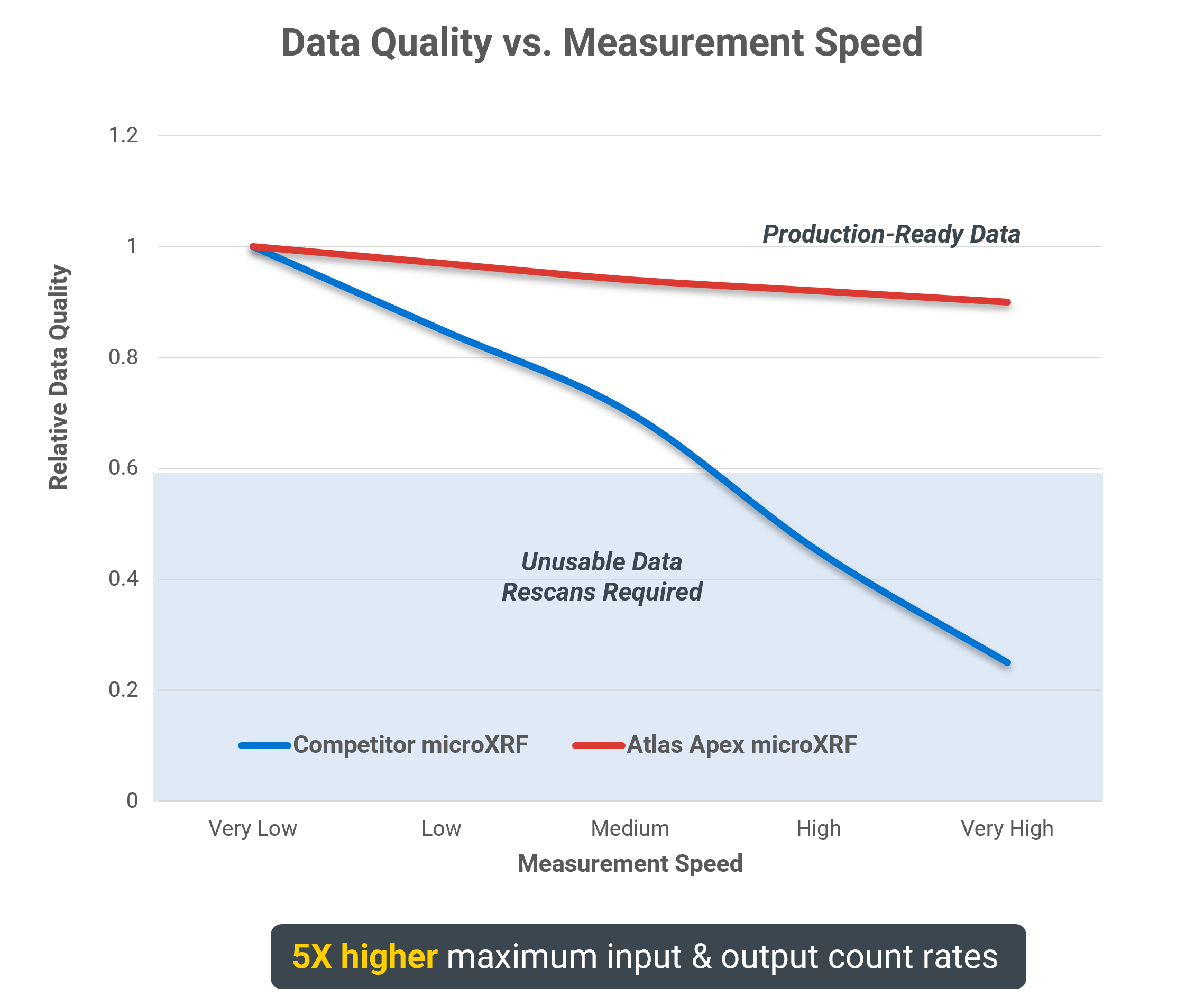 Line chart illustrating how relative microXRF data quality changes as measurement speed increases from Very Low to Very High. The Atlas Apex microXRF (red curve) maintains near-constant, production-ready data quality across the full speed range, while a competitor microXRF (blue curve) shows a steep decline at higher speeds, crossing into a shaded “Unusable Data / Rescans Required” zone.